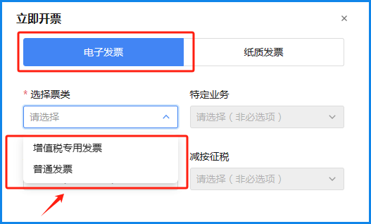 五、根据需求选择开具专票或普票,通常默认的都是电子发票,如果有客户需要开全电纸质发票的,就点击右边的纸质发票进行选择,其余的非必填项不填。