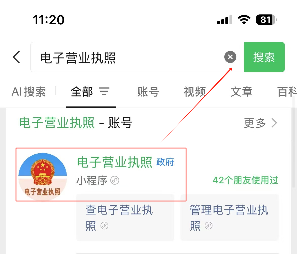 申领步骤: 1、进入小程序:打开微信/支付宝,点击上方“搜索”输入“电子营业执照”并进入小程序。