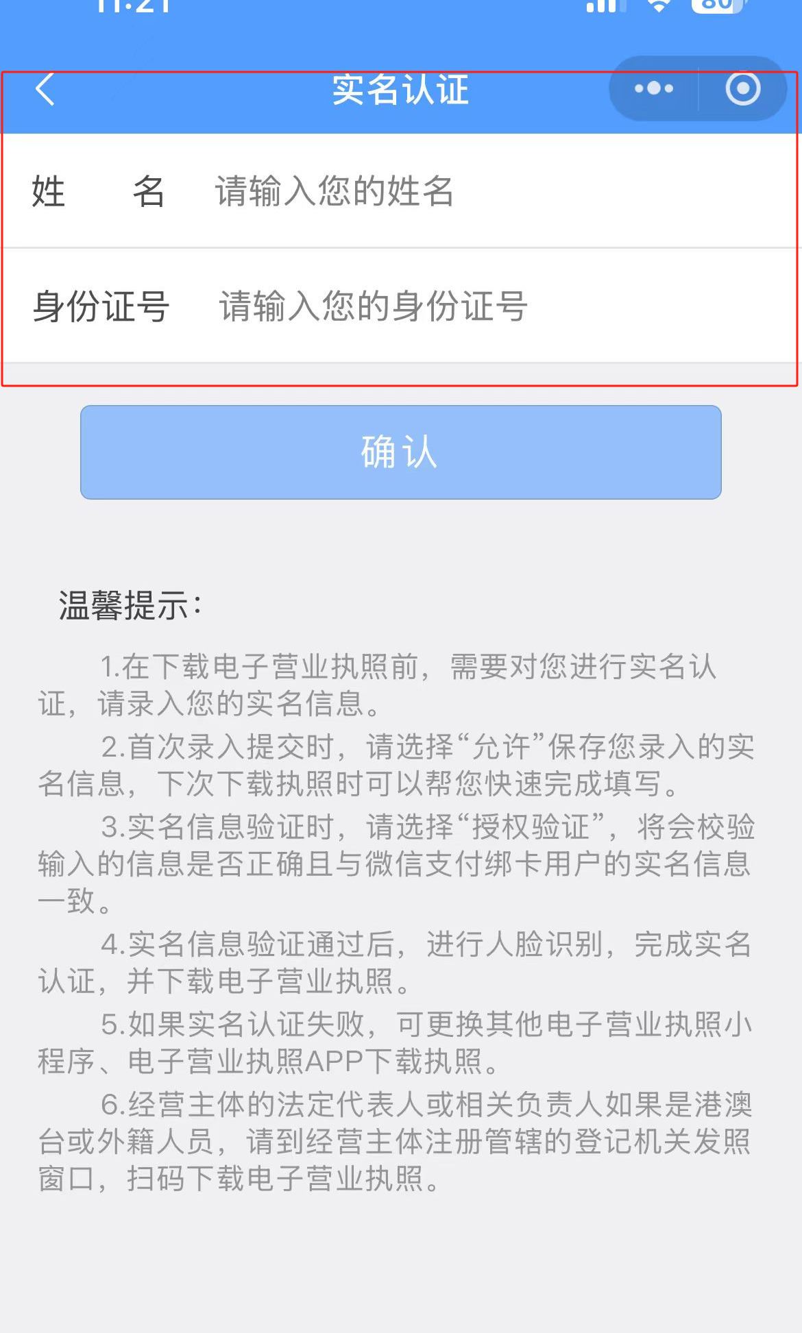 2、实名认证:点击“下载执照”,输入法定代表人的姓名、身份证号,点击“确认”。授权微信/支付宝验证实名信息,并进行人脸识别(需确保为本人操作)