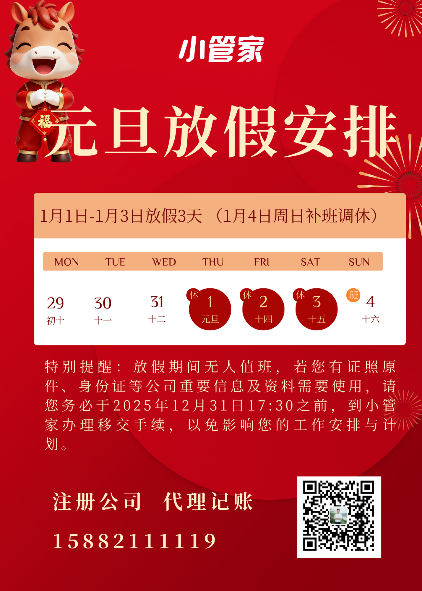 二、特别提醒:放假期间无人值班,若您有证照原件、身份证、印章、网银U盾等公司重要信息及资料需要使用,请您务必于2025年12月31日17:30之前,到小管家办理移交手续,以免影响您的工作安排与计划。