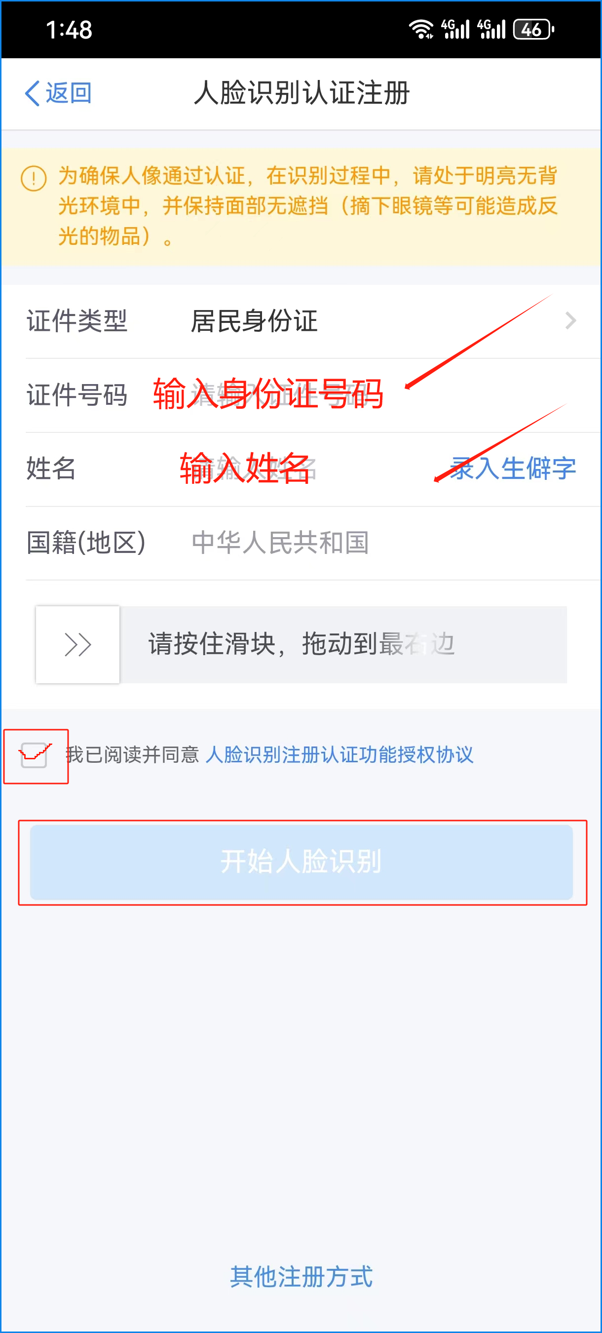 三、登陆界面点击“注册”—“人脸识别认证注册”,然后输入对应的身份证号及姓名后点“开始人脸识别” 四、返回登陆界面,输入刚注册的身份证号及密码点击登陆 成都注册公司、温江注册公司找小管家财务:15882111119