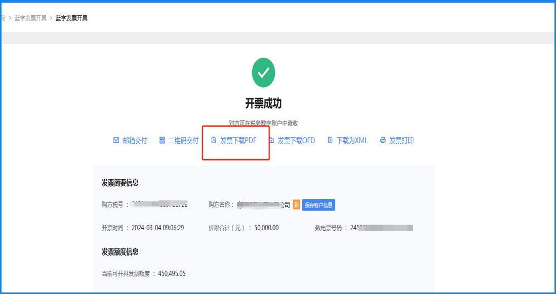 七、通常下载PDF版本的发票给客户就可以了,有的需要OFD版本的或者二维码、邮箱方式交付的,点击旁边的其他交付方式就可以了。