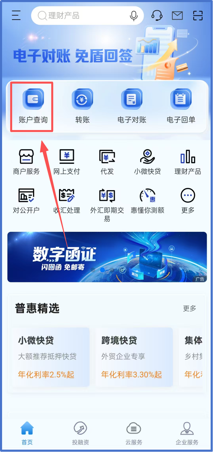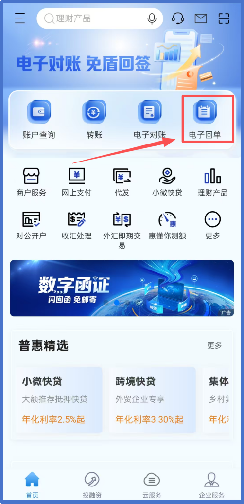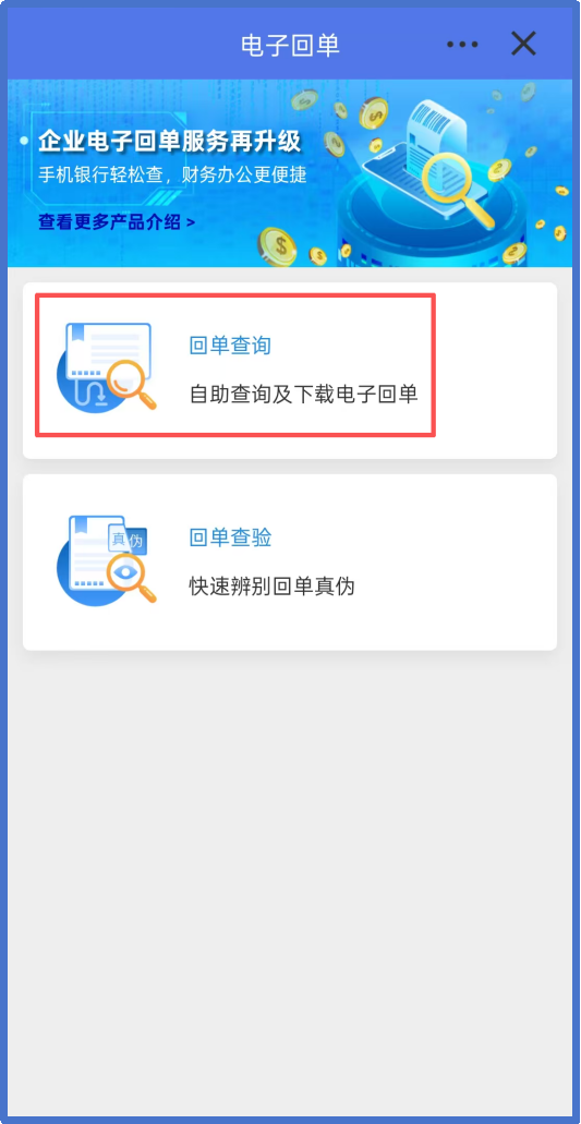 在首页点击【电子回单】,进入回单界面后,选择【回单查询】