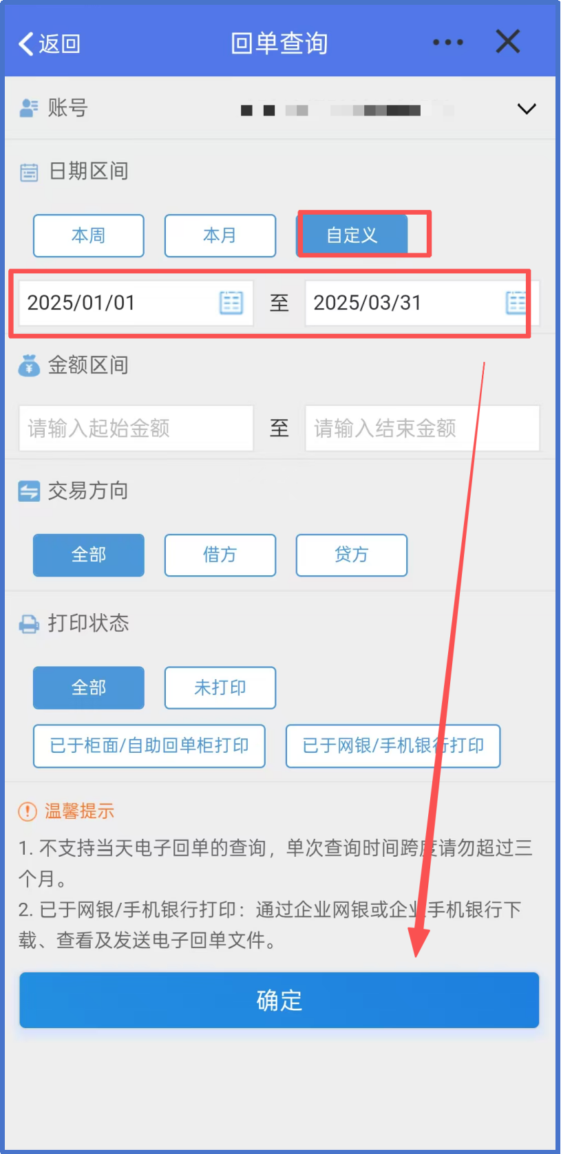 由于回单只能导3个月,所以期间选择在3个月以内,点击【自定义】,下面的期间选择三个月以内,然后点击【确定】。