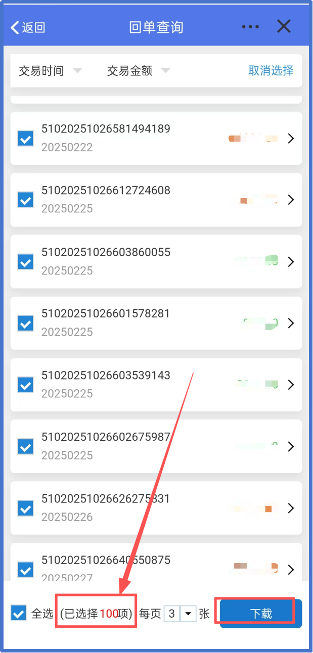 之后会进入回单界面,点击【批量选择】,但只能选择100项才能用手机导出来。