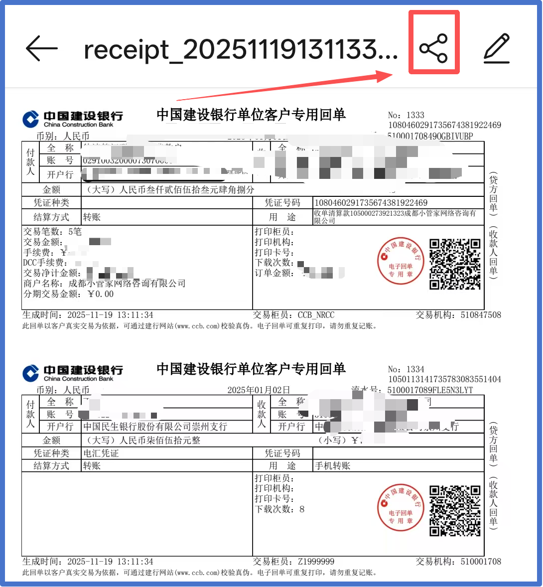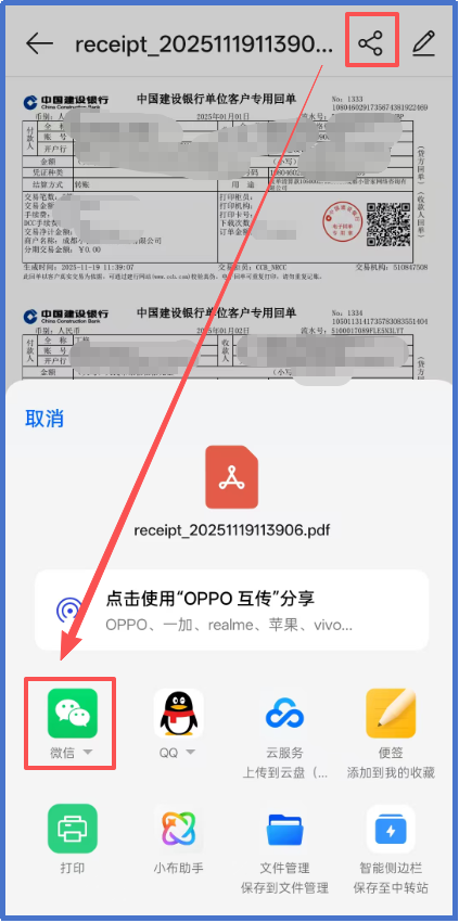 点击【下载】,然后进入回单预览界面,将回单分享到微信,发送到对应的微信群就可以了哦。
