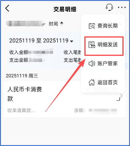 进入【交易明细】界面后,如果是3个月内的流水,就点击【明细发送】