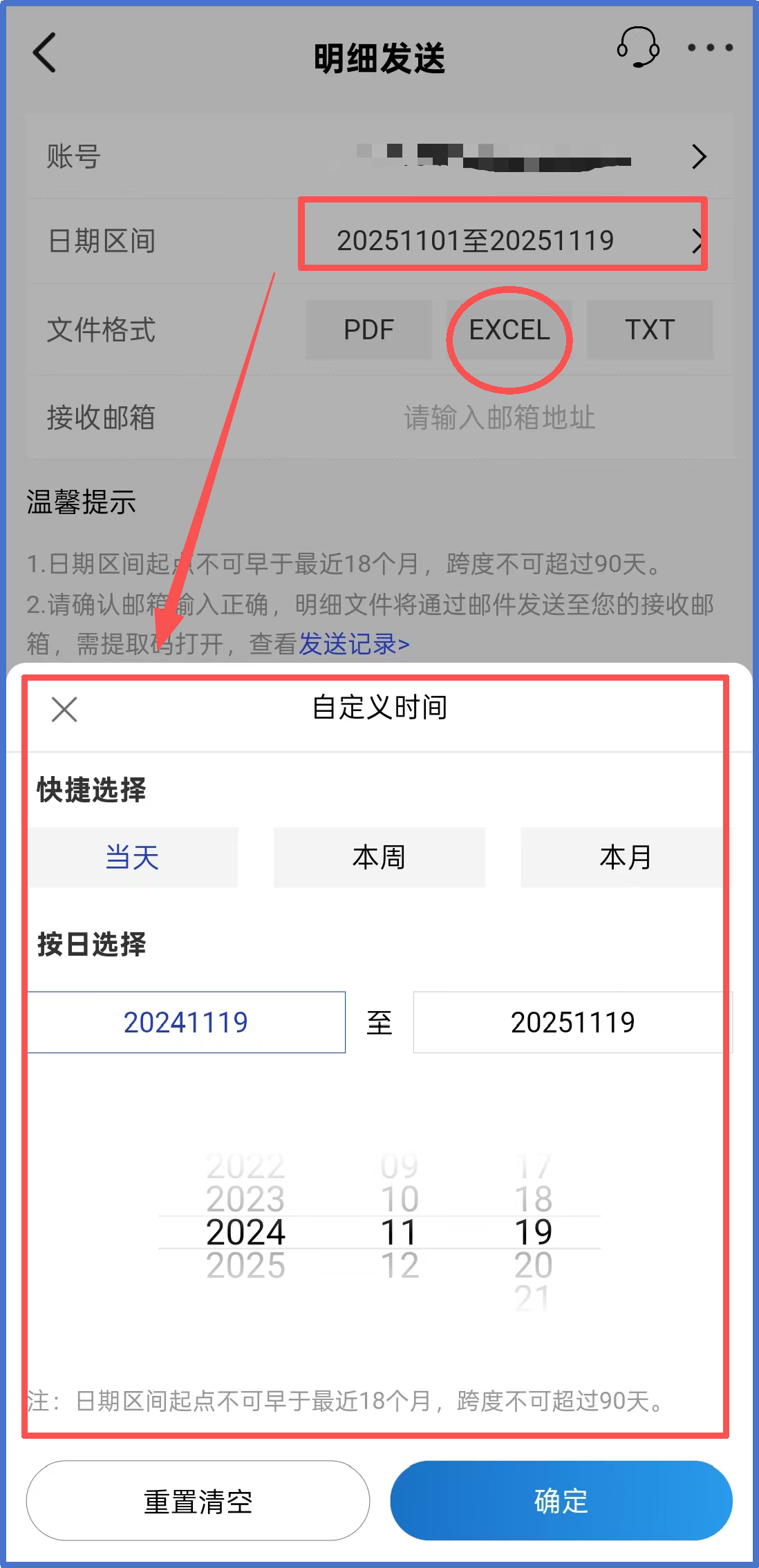 在【明细发送】界面,点击【日期区间】选择三个月以内的时间段,然后在【文件格式】一栏选择Excel格式,接收邮箱填写,就可以了哦。