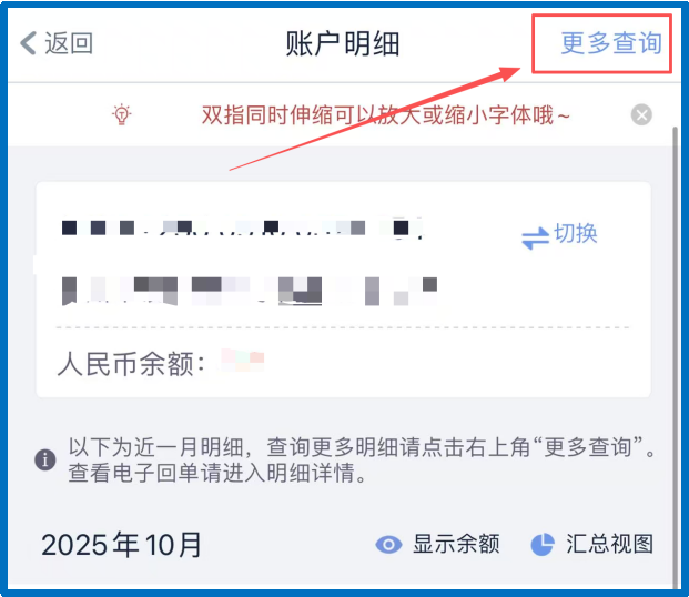 点击【账户管理】,进入界面后,点击【账户明细】,在右上角选择【更多查询】