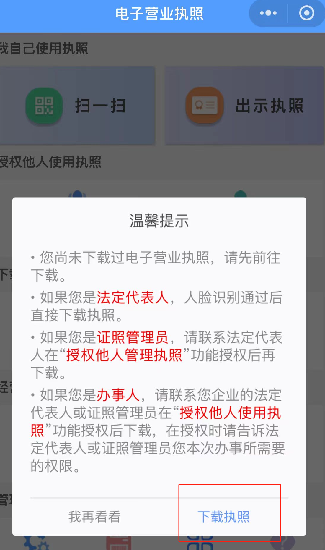 尚未领取电子营业执照的,需要电子营业执照的,可以由企业法定代表人在微信 APP/支付宝 APP 上搜索“电子营业执照”(或扫下方二维码)进入小程序后下载电子营业执照。