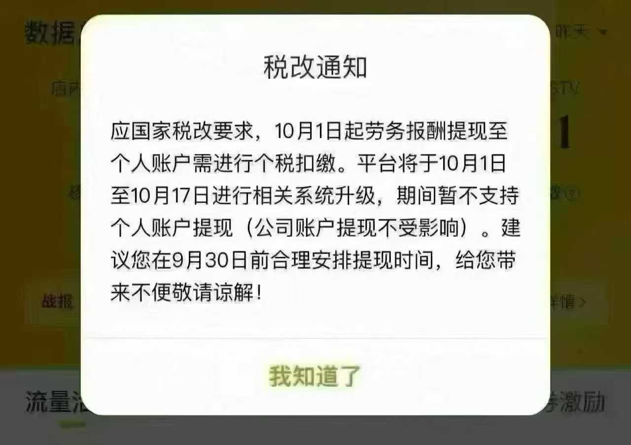 10月1日起,电商绑定个人银行卡的,将进行个税扣缴,且10.1-10.17号间个人账户无法提现(公司账户提现不受影响)